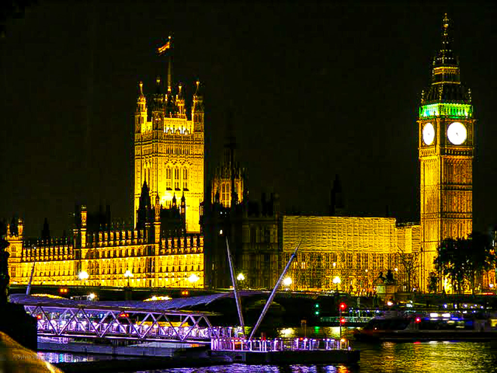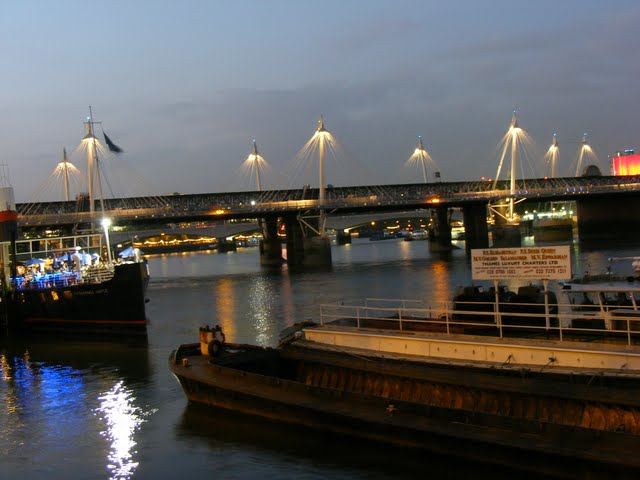 Das ist die Golden Jubilee Bridges, die beidseitig die Hungerford Railway Bridge flankieren. Sie befinden sich im Herzen Londons und überspannen die Themse zwischen dem Bahnhof Charing Cross und der South Bank. Die markanten, beleuchteten Pylone und die elegante Seilstruktur machen sie besonders nachts zu einem echten Blickfang. Die Brücken sind reine Fußgängerbrücken und bieten einen herrlichen Blick auf die Stadt – perfekt für einen abendlichen Spaziergang entlang der Themse