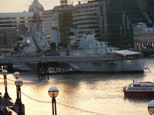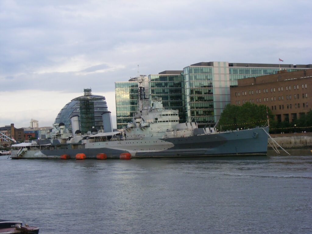 Das Schiff auf dem Bild ist die HMS Belfast, ein historischer Kreuzer der Royal Navy. Sie liegt dauerhaft auf der Themse in London, nahe der Tower Bridge, und dient heute als Museumsschiff, betrieben vom Imperial War Museum.