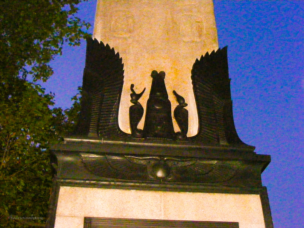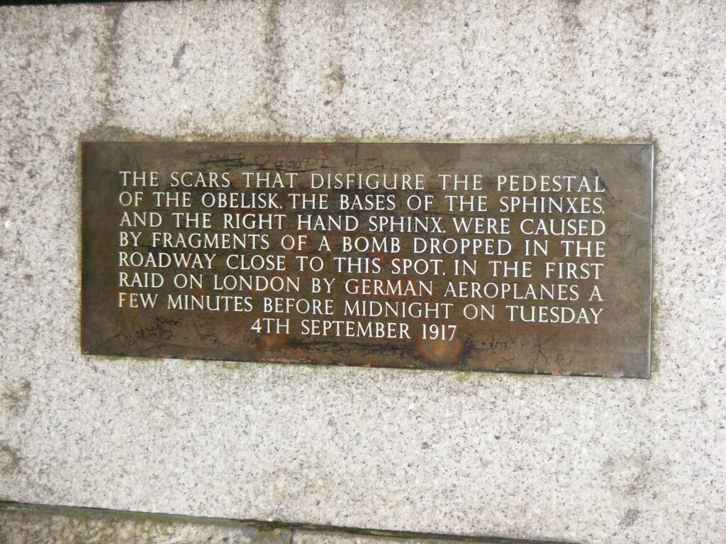 „Die Narben, die den Sockel des Obelisken, die Basen der Sphinxe und den rechten Sphinx verunstalten, wurden durch Splitter einer Bombe verursacht, die in der Fahrbahn nahe dieser Stelle abgeworfen wurde – beim ersten Luftangriff deutscher Flugzeuge auf London, wenige Minuten vor Mitternacht am Dienstag, dem 4. September 1917.“