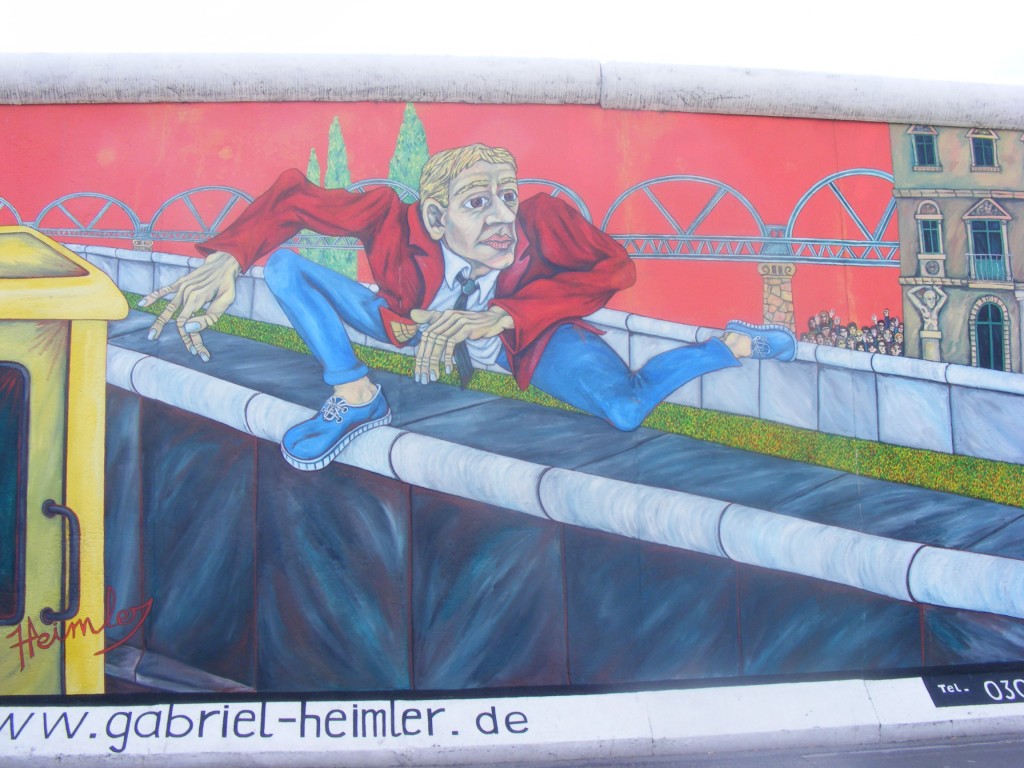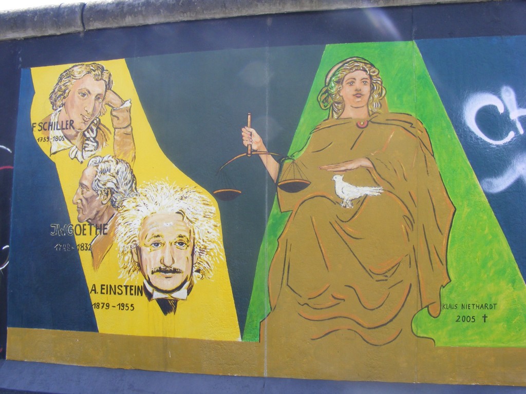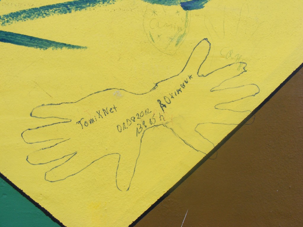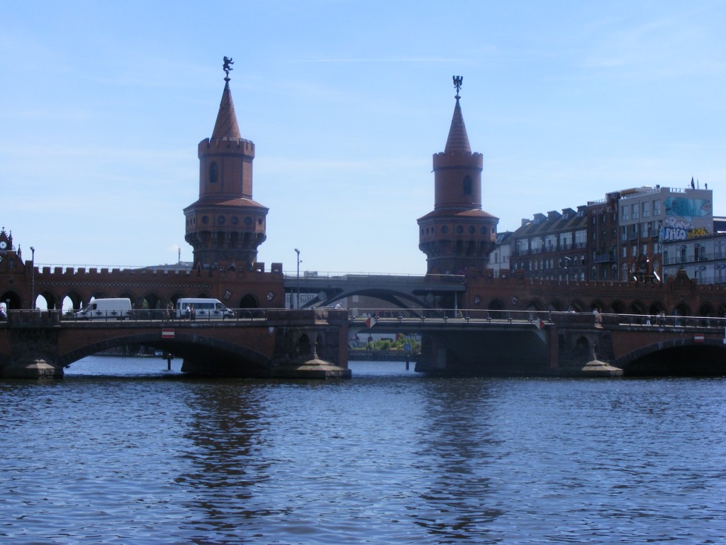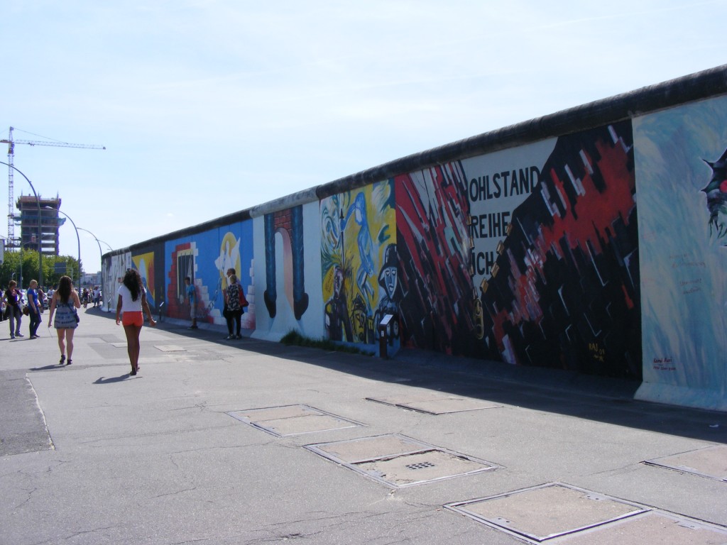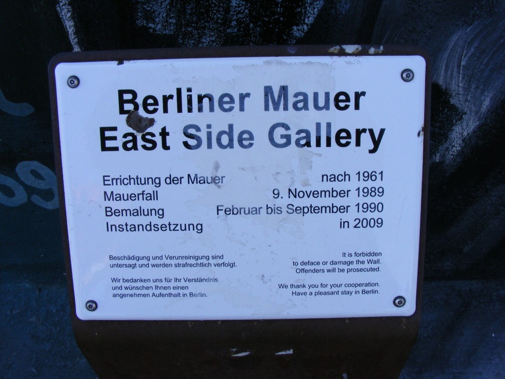 Da wir aber bis 15 Uhr noch Zeit hatten, fuhren wir zuerst zur East-Side Gallery. Wir fuhren bis Ostbahnhof und liefen die Mauer bis zur Oberbaumbrücke entlang. Diese Mauer ist mit Graffitti bemalt teilweise mit Zeichnungen aus dem ehemaligen Leben in der DDR. An einer Stelle der Mauer verewigten wir uns mit unseren Handabdrücken. Darein schrieben wir dann unsere Cachernamen. Leider konnten wir den Multi an der East-Side Gallery nicht lösen, da wir das Schild nicht gefunden haben.