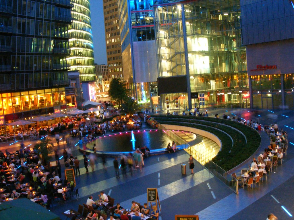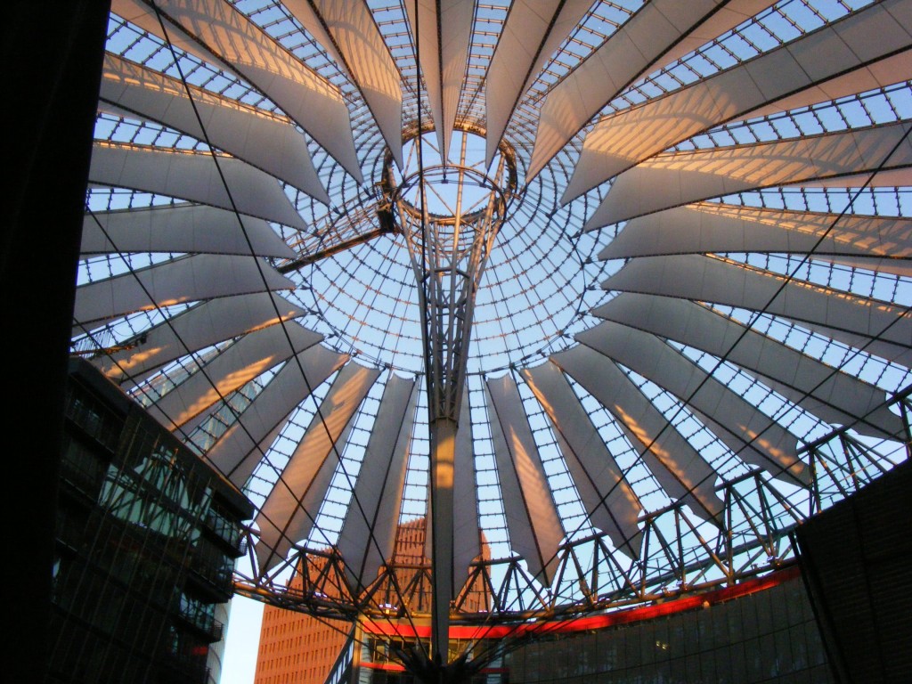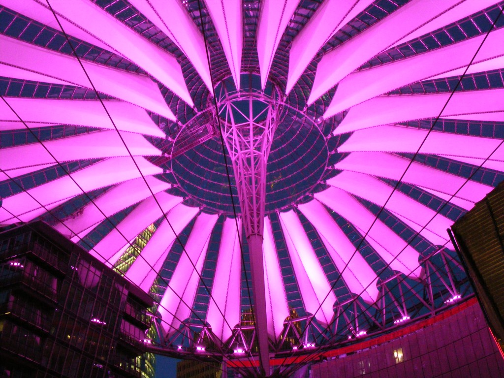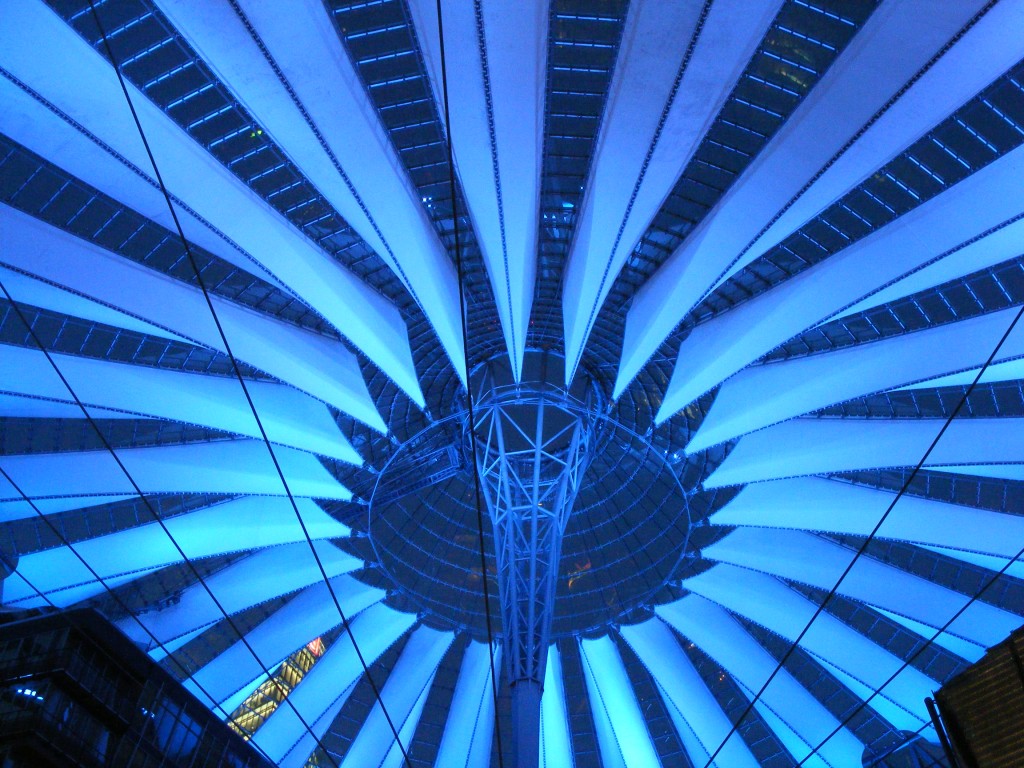 Während wir aßen wurde es um uns herum schon dunkel. Jetzt sah man erstmal wie toll das Sony Center wirklich ist. Diese Art der Deckenbeleuchtung war wunderschön. Mal blau, mal lila und dann wieder blau. Auch der Innenhof vom Sony Center war klasse gestaltet.