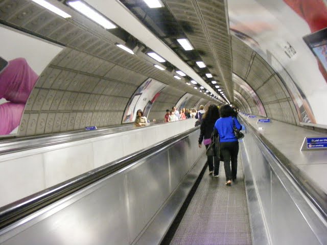 Zu jeder unterirdischen Station gibt es diese Rollbänder. Auf den Rollbändern bleiben die wenigsten Leute stehen. Aber wenn sie stehen bleiben, dann stehen alle rechts, so daß links die laufenden Leute vorbei können. Es braucht keiner fragen ob man mal vorbei kann, weil man es eilig hat .