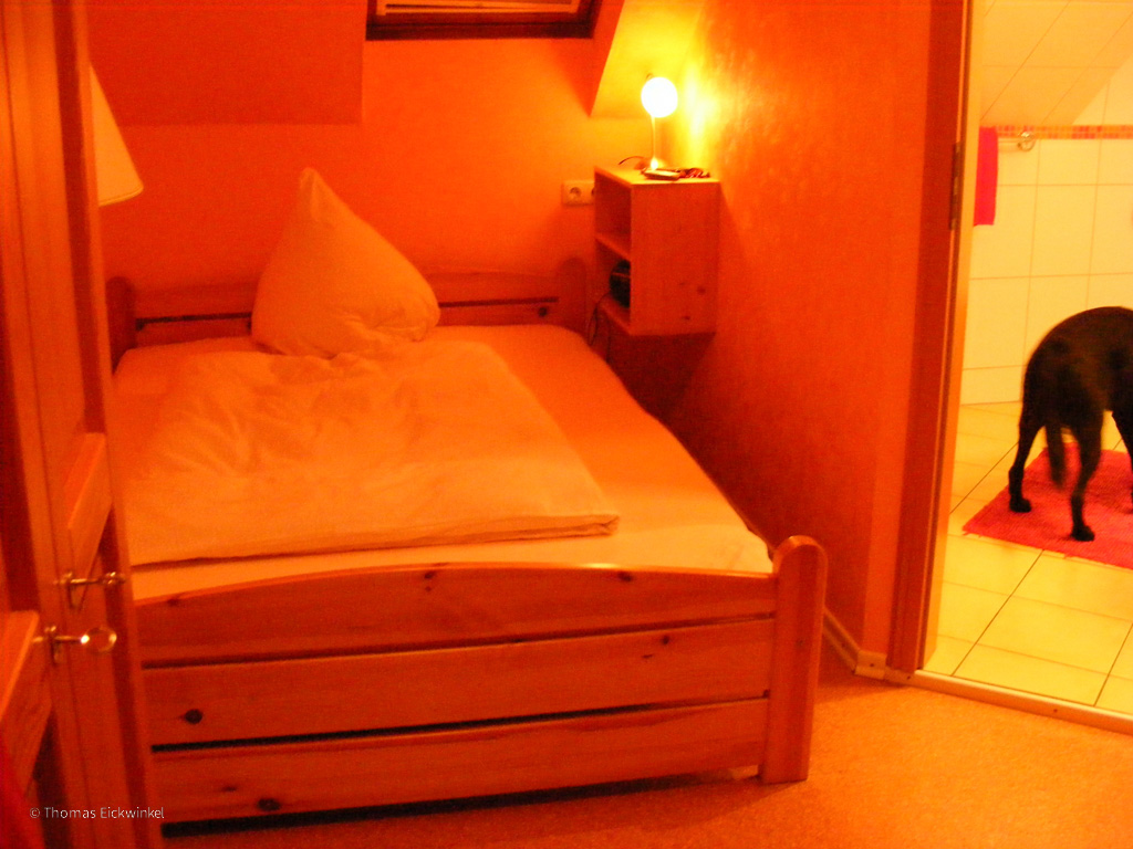 Nach dem Aufwachen habe ich erstmal noch im Liegen das Zimmer angeschaut. Es ist sehr schön, die Tapeten in orange, der Schrank, das Bettregal aus Kiefer und die Türen aus anderem hellen Holz mit Bronzebeschlägen. Ich habe einen Fernseher im Zimmer. Das Bad hat weiße Bodenfliesen,