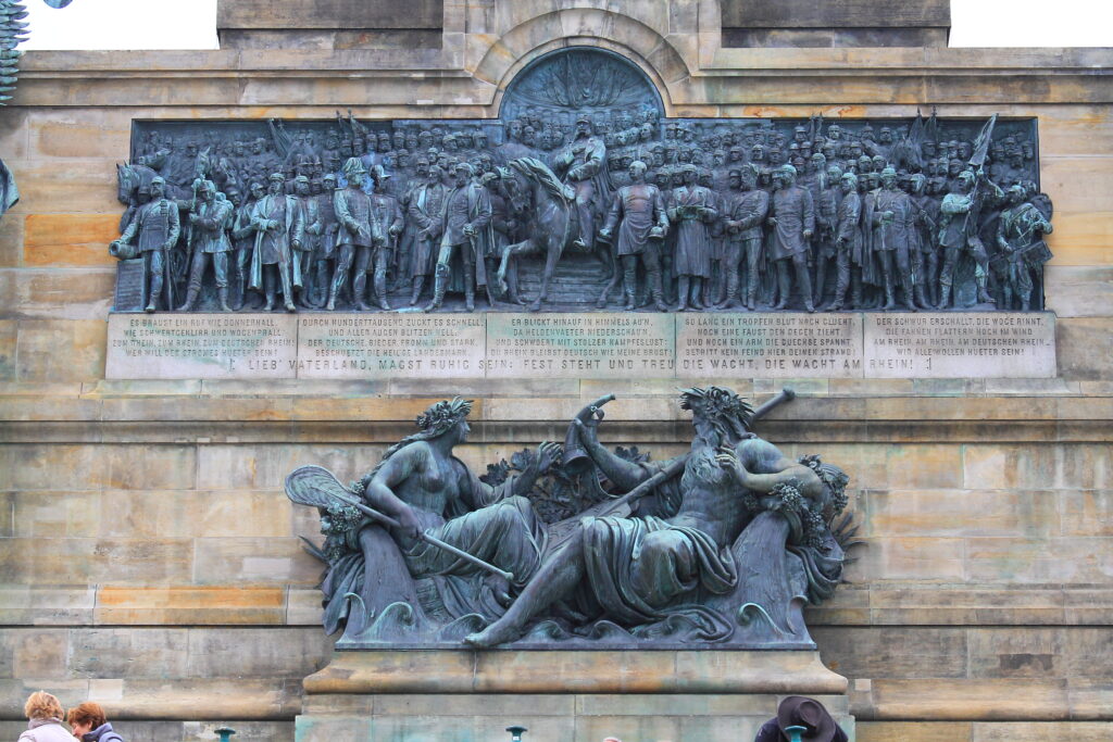 - Die Inschrift im Hintergrund beinhaltet Verse aus dem Lied „Die Wacht am Rhein“.
